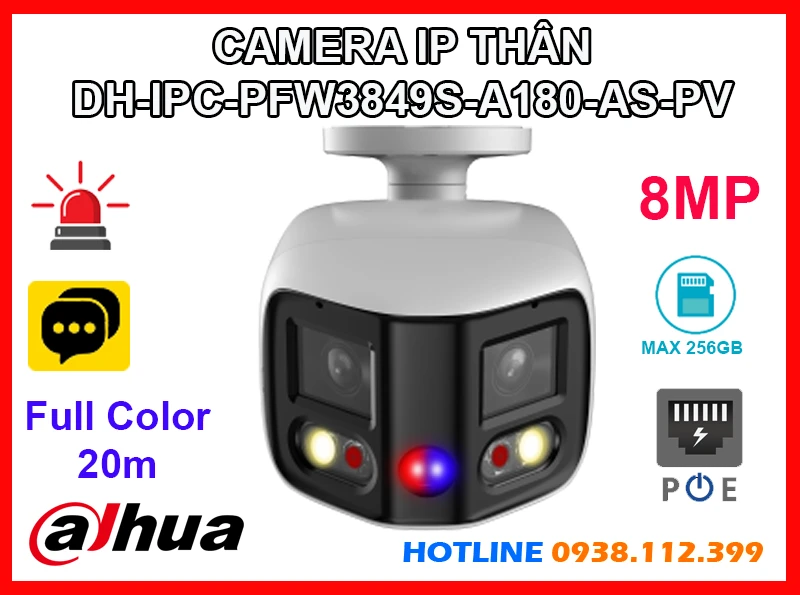 Camera Dahua DH-IPC-PFW3849S-A180-AS-PV là siêu phẩm an ninh thế hệ mới tích hợp công nghệ TiOC Duo với độ phân giải 8MP cho hình ảnh siêu nét và góc nhìn toàn cảnh 180°. Hỗ trợ ghi hình ban đêm vượt trội với hồng ngoại 25m, full color 20m, đàm thoại hai chiều rõ ràng, cùng khe cắm thẻ nhớ 256GB đáp ứng nhu cầu lưu trữ dài hạn, thiết kế chuẩn IP67 chống bụi nước, cấp nguồn POE